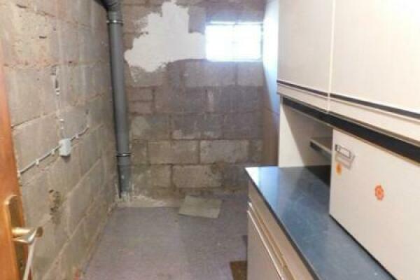 Vom Eingangsbereich mit Diele geht es rechter Hand ein paar Stufen hinab zu einer üppig dimensionierten Wohnküche und zum tageslichthellen Badezimmer. Daneben liegen 2 Vorrats/ Lagerräume.