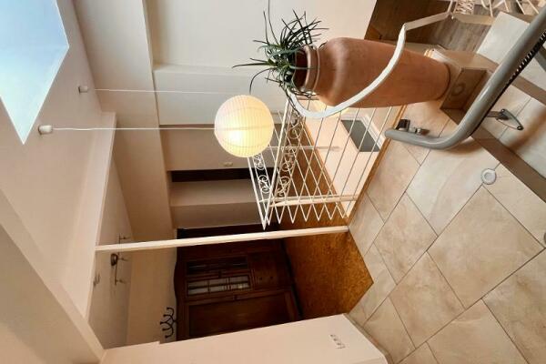 Dieser ursprüngliche Innenhof wurde komplett umbaut und mit einer Tageslicht Kuppel ausgestattet. Durch diesen Umbau wurde Platz geschaffen für die Treppe ins Obergeschoss, zum Garten und - ebenerdig - den Zugang zu einem neuen, modernen Badezimmer und zum alten Gewölbekeller, der heute als Vorratsraum dient.