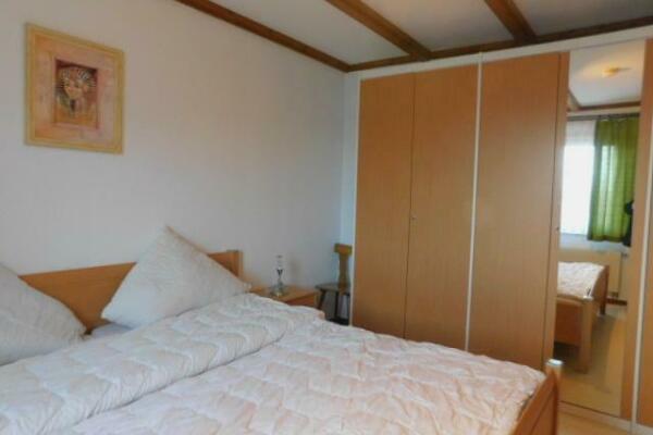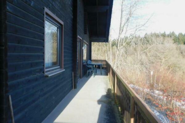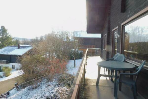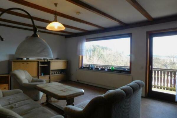 Der größte Teil der Wohnung wird vom angrenzenden Wohnzimmer eingenommen, das mit seiner großen Fensterfront zum Tal hin ausgerichtet ist. Von hier und vom davorliegendem und rundum verlaufenden Balkon kann man einen herrlich Blick über den angrenzenden Hochwald und den Ort Thalfang bis hin zum Erbeskopf genießen.