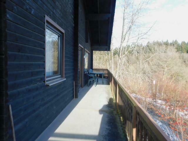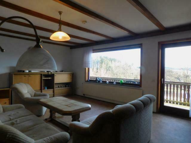 Der größte Teil der Wohnung wird vom angrenzenden Wohnzimmer eingenommen, das mit seiner großen Fensterfront zum Tal hin ausgerichtet ist. Von hier und vom davorliegendem und rundum verlaufenden Balkon kann man einen herrlich Blick über den angrenzenden Hochwald und den Ort Thalfang bis hin zum Erbeskopf genießen.
