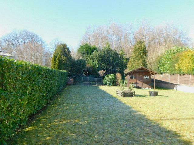 Gartenanlage mit Rasenfläche hinter und neben dem Haus und einem Gartenhaus am Ende des Gartens..