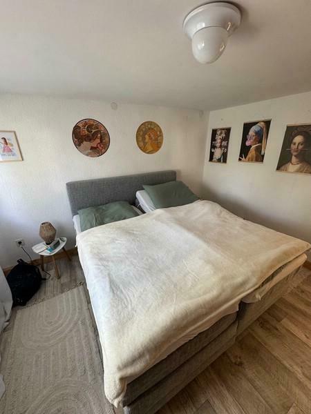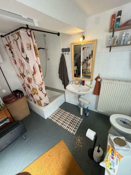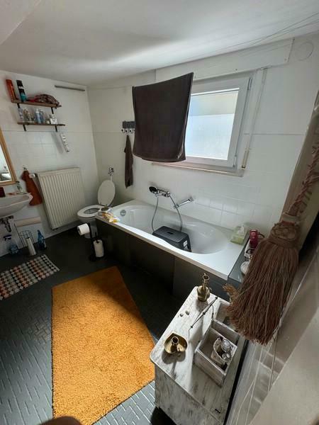 Neben der Treppe befindet sich das Badezimmer. Es verfügt über WC, Badewanne, Dusche, einen separaten Hygienebereich sowie ein Fenster. Ein Anschluss für die Waschmaschine ist ebenfalls vorhanden.
