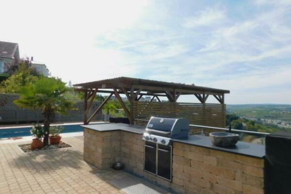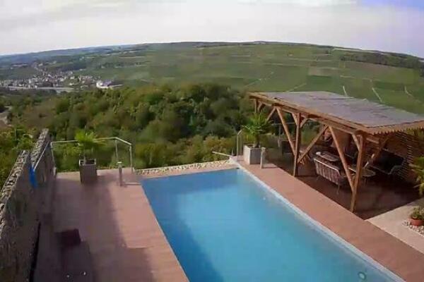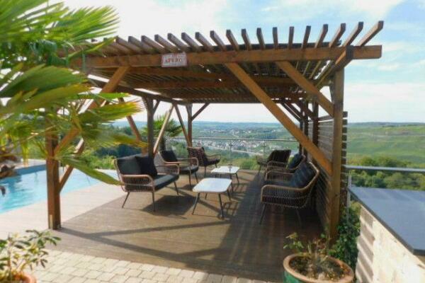 Der zum Moseltal hin ausgerichtete Außenbereich wird dominiert von einer großen Freiterrasse incl. Poollandschaft. Eine separate Lounge mit angrenzender Grillstation, ein direkt ans Haus gebauter und überdachter Freisitz sowie eine entsprechende Bepflanzung, runden die mediterrane Garten- bzw. Terrassengestaltung ab.