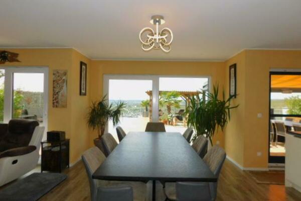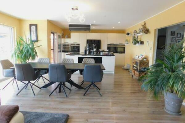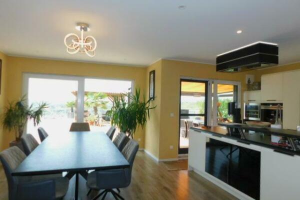 Mit der offenen Küche mit Kochinsel, dem mittig gelegenen Essbereich und dem angrenzenden Wohnzimmer mit Kaminofen, bildet dieser Bereich den stilvollen Mittelpunkt des Hauses. Von hier kann man bereits die Aussicht auf die davorliegende Poollandschaft, die üppig dimensionierte Terrasse und die in der Ferne erkennbaren Höhen Luxemburgs genießen.