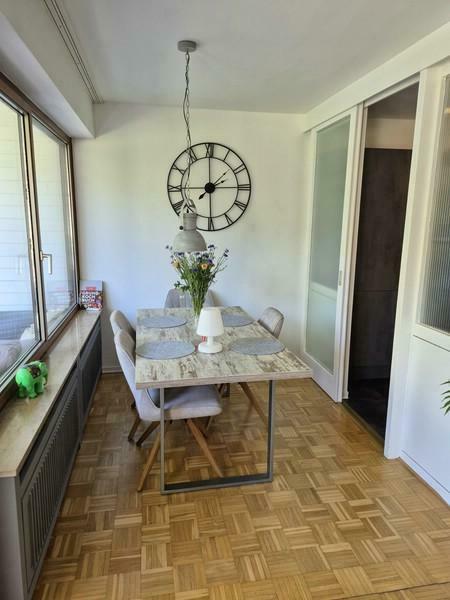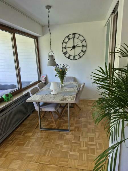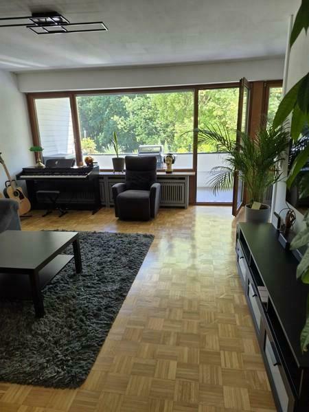 Gegenüber dem Schlafzimmer befindet sich der Zugang zum Wohnzimmer, das durch große Fenster gut belichtet ist. Vom Wohnzimmer aus gelangen Sie auf den 14 m² großen Balkon mit Blick ins Grüne, der nach Süd-Südost ausgerichtet ist. Rechts vom Wohnzimmer liegt der Essbereich, der bei Bedarf durch Schiebetüren von der Küche abgetrennt werden kann.