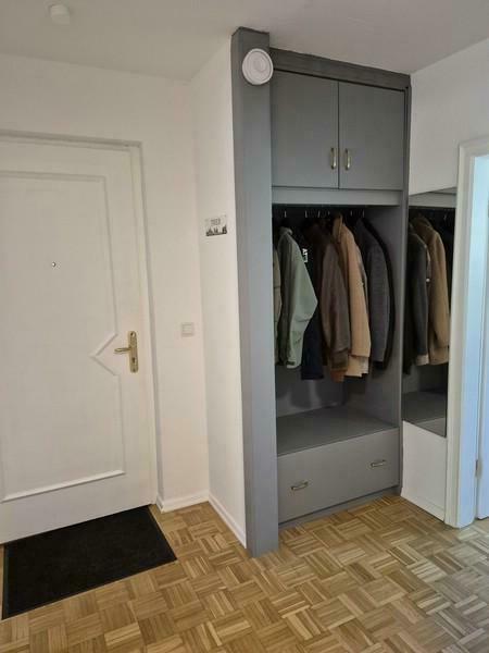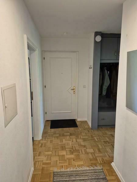 Beim Betreten der Wohnung gelangen Sie in einen zentralen Flur, von dem aus alle Räume erreichbar sind. Auf der rechten Seite befindet sich eine Garderobe. Rechts liegt ein flexibel nutzbares Zimmer, beispielsweise als Büro oder Schlafzimmer, gegenüber befindet sich die Küche, die mit einer Einbauküche ausgestattet ist und im Kaufpreis enthalten ist. Weiter geradeaus liegt das Badezimmer mit Dusche, WC und Waschbereich, daneben befindet sich das Hauptschlafzimmer sowie ein kleines Gäste-WC.