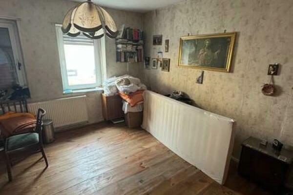 Beim Betreten des Hauses gelangen Sie zunächst in den zentralen Flur. Auf der linken Seite befindet sich ein Schlafzimmer, während sich rechts das Wohnzimmer anschließt. Vom Flur aus führt eine Treppe ins Obergeschoss.