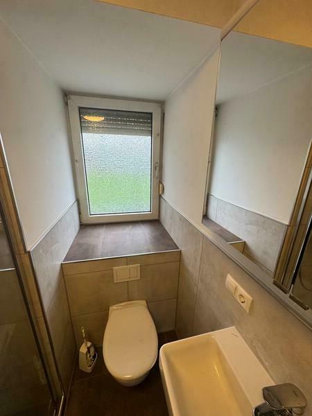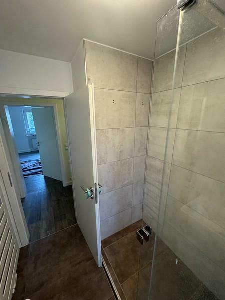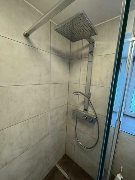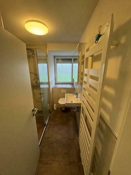 Direkt rechts befindet sich das 2022 komplett erneuerte Bad mit WC und Dusche samt Regenkopf.