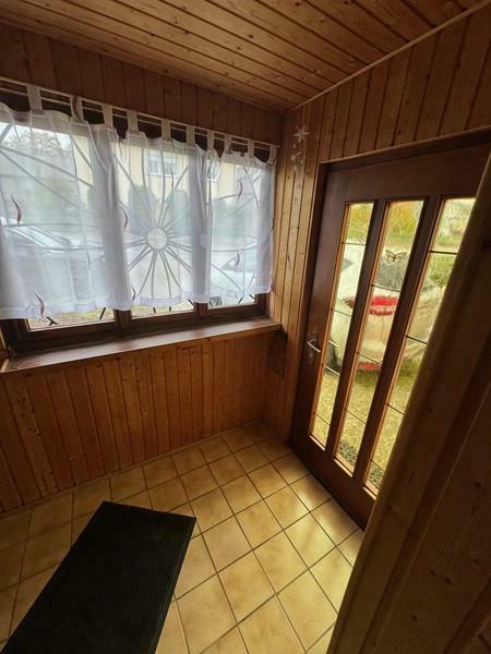 Beim Betreten des Hauses gelangen Sie zunächst in einen Windfang, von dem aus Sie in den zentralen Flur des Hauses gelangen. Auf der linken Seite befindet sich das Wohnzimmer, geradeaus der Wintergarten, der ausreichend Platz für eine gemütliche Sitzecke bietet. Das Badezimmer auf der rechten Seite des Flurs ist mit einer barrierefreien Dusche, einem Waschbecken sowie einem Waschmaschinenanschluss ausgestattet. Daneben liegt das Gäste-WC, das über ein Fenster verfügt. Die Küche, ausgestattet mit einer Einbauküche, befindet sich links vom Wohnzimmer.