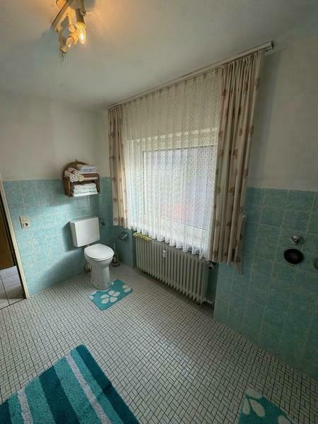 Links neben der Küche befindet sich das Familienbad, das mit WC, zwei Waschbecken, einer Duschwanne und einem großen Fenster ausgestattet ist. Daneben liegt ein kleines Gäste-WC, ebenfalls mit Fenster.