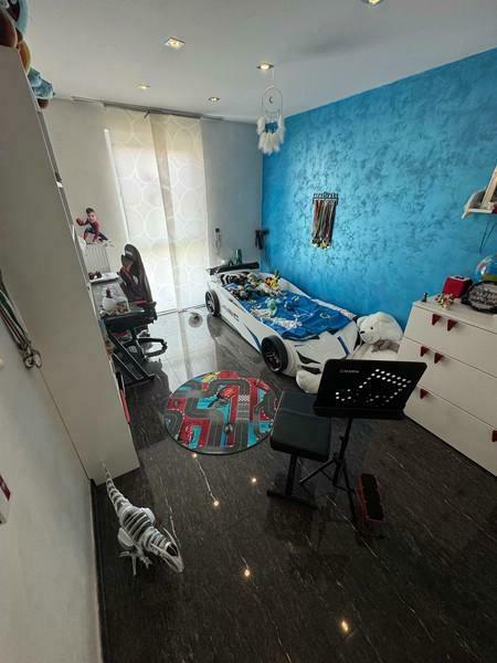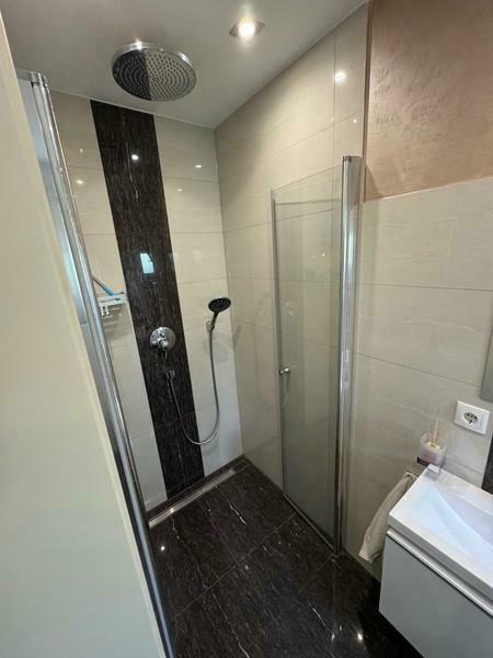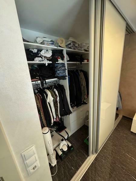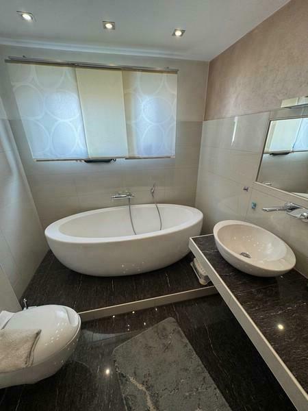 Im Obergeschoss befindet sich auf der rechten Seite das großzügig geschnittene Elternschlafzimmer. Direkt daneben liegt ein weiteres, etwas kleineres Schlafzimmer, das sich ideal als Kinderzimmer eignet. Anschließend folgt das modern ausgestattete Badezimmer mit freistehender Badewanne, Bidet, WC und einem Hygienebereich.