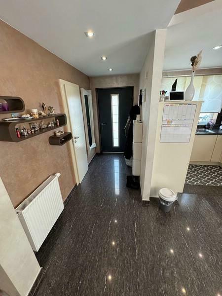 Beim Betreten des Hauses befindet sich auf der rechten Seite ein Gäste-WC mit barrierefreier Dusche, Hygienebereich und Fenster. Folgt man dem Flur weiter, gelangt man auf der rechten Seite in den offenen Küchenbereich, der mit einer modernen Einbauküche ausgestattet ist. Daran anschließend öffnet sich der großzügige Ess- und Wohnbereich, der ein harmonisches Raumgefühl vermittelt. Auf der rechten Seite befindet sich die Treppe, die sowohl in das Obergeschoss als auch in den Keller führt. Am Ende des Wohnbereichs bietet eine Doppeltür den Zugang zur überdachten Terrasse und in den Garten.
