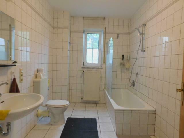 Das Badezimmer ist mit einer Wanne, Toilette und Handwaschbecken ausgestattet und auch der Waschmaschinenanschluss befindet sich hier.