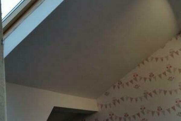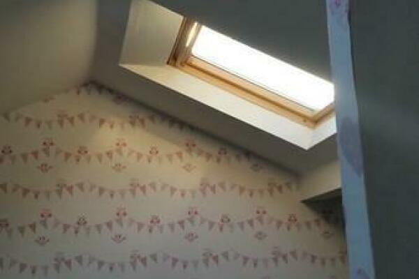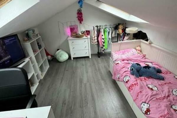 Ebenfalls über diesen Flur gelangt man in das Schlafzimmer. Eine Holztreppe im Flurbereich führt in das ausgebaute Dachgeschoss, in dem sich zwei weitere Zimmer befinden, die sich Kinderzimmer eignen.