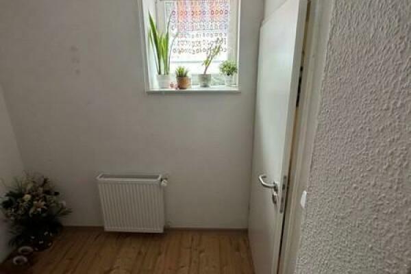 Geradeaus erreicht man den Wohnbereich, der mit einem Kaminofen ausgestattet ist. Von dort aus führt links ein kleiner Flur, über den das Badezimmer zugänglich ist. Das Badezimmer ist mit einer Duschwanne, einem Waschbecken und einem WC ausgestattet. Direkt daneben befindet sich ein Abstellraum mit zusätzlicher Toilette, Waschbecken sowie einem Waschmaschinenanschluss.