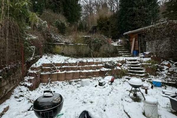 Dieses Gebäude wurde ursprünglich als Einfamilienhaus errichtet und später zu einem Zweifamilienhaus umgebaut. Das Dachgeschoss ist ausgebaut, sodass eine der Wohneinheiten über zwei Etagen genutzt wird. Die Heizungsanlage wurde im Obergeschoss bereits 2016 auf eine Gasbrennwerttechnik umgestellt, im Untergeschoss erfolgte die Erneuerung der Heizungsanlage im Jahr 2024. Im Bereich des Erdgeschosses wurde eine frühere Feuchtigkeitsproblematik an der hangseitigen Rückwand durch Sanierungsmaßnahmen im Innen- und Außenbereich dauerhaft behoben. Zur Ableitung von anfallendem Wasser auf der hangseitigen Terrasse ist ein automatisches Pumpensystem installiert, welche das Wasser kontrolliert in den Kanal leitet.