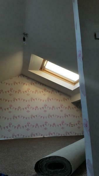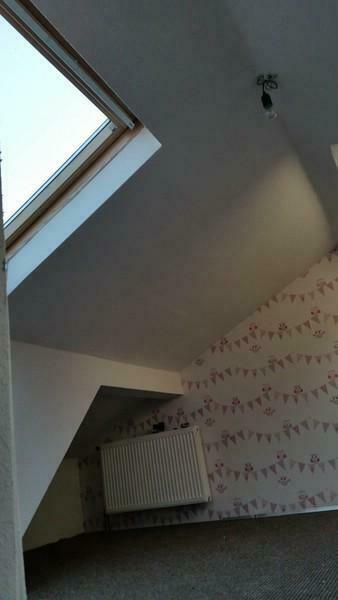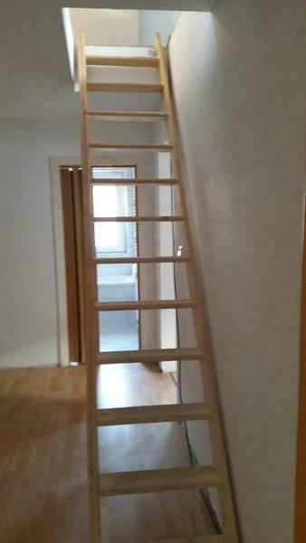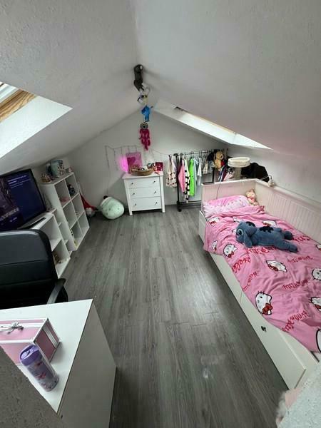 Ebenfalls über diesen Flur gelangt man in das Schlafzimmer. Eine Holztreppe im Flurbereich führt in das ausgebaute Dachgeschoss, in dem sich zwei weitere Zimmer befinden, die sich Kinderzimmer eignen.