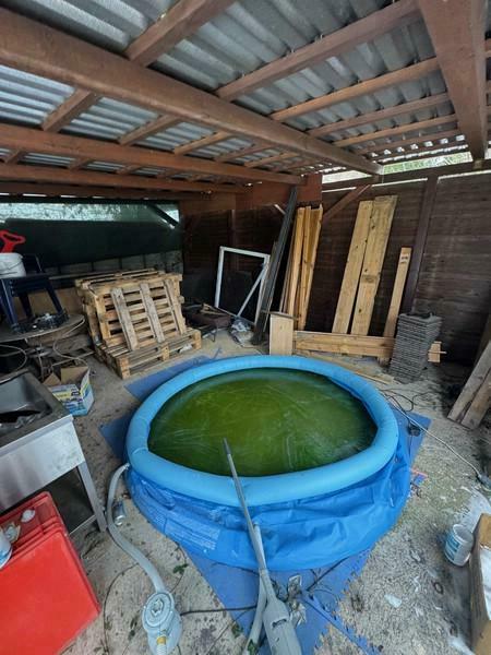 Geradeaus erreicht man den Wohnbereich, der mit einem Kaminofen ausgestattet ist. Von dort aus führt links ein kleiner Flur, über den das Badezimmer zugänglich ist. Das Badezimmer ist mit einer Duschwanne, einem Waschbecken und einem WC ausgestattet. Direkt daneben befindet sich ein Abstellraum mit zusätzlicher Toilette, Waschbecken sowie einem Waschmaschinenanschluss.