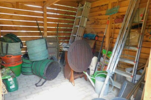 Ein kleines Gartenhaus am Ende des Grundstücks dient als Unterstellplatz für Gartengeräte usw.