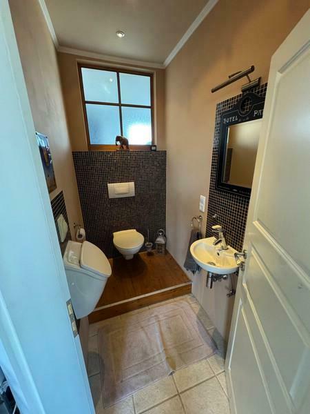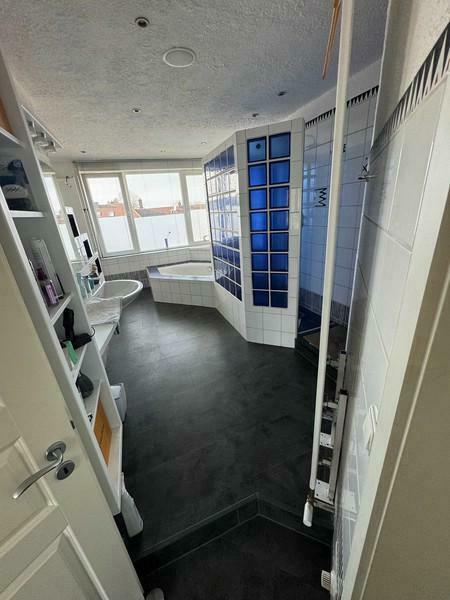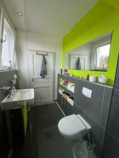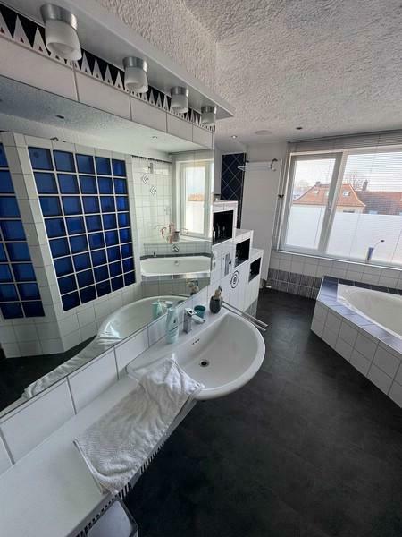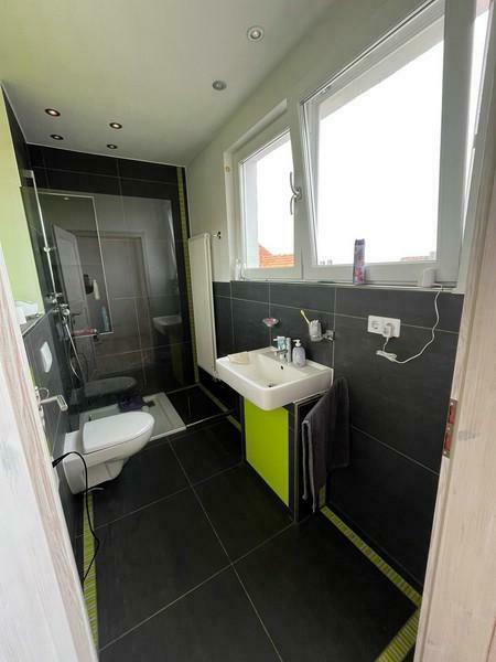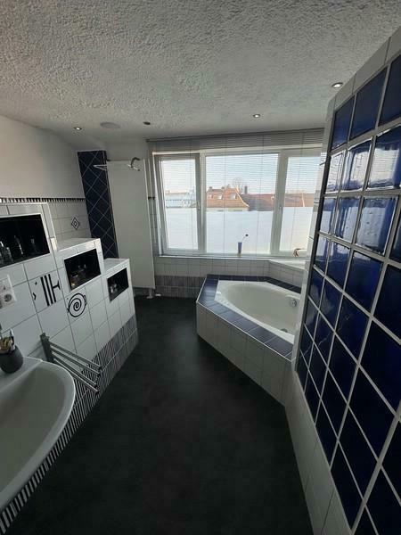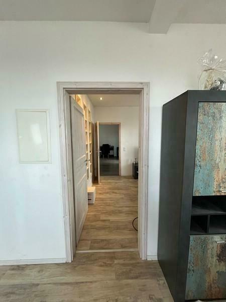 Geradeaus vom Eingangsbereich aus liegt der Zugang zur Hauptwohnung. Beim Betreten öffnet sich hier ein großzügiger Loftbereich. Auf der rechten Seite befindet sich das Badezimmer, ergänzt durch einen separaten Heizungsraum mit Waschmaschinenanschluss. Das Badezimmer ist mit einer barrierefreien Dusche, einer Eckbadewanne, WC, Bidet, Hygienebereich sowie einem Fenster ausgestattet.