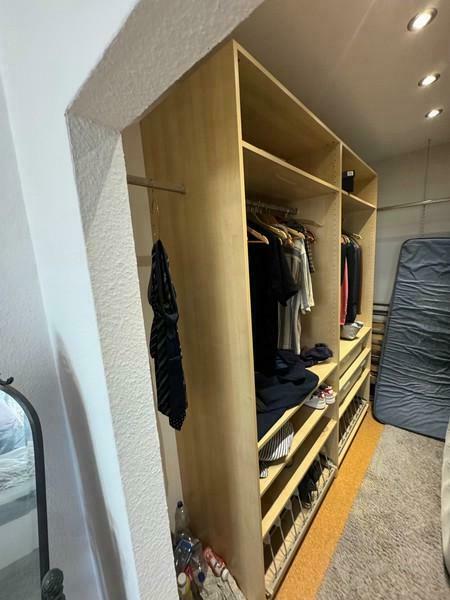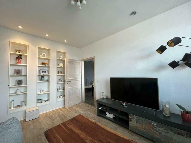 Diese umfasst eine Küche mit vorhandenen Anschlüssen (derzeit ohne Einbauküche), eine ca. 9 m² große Loggia in Form eines überdachten Balkons sowie ein Schlafzimmer mit begehbarem Kleiderschrank. Über einen Durchgang mit Garderobenbereich besteht zudem eine Verbindung zum Flur der Hauptwohnung. Die Einliegerwohnung ist als Zwei-Zimmer-Wohnung konzipiert und verfügt über ein Badezimmer mit Dusche.