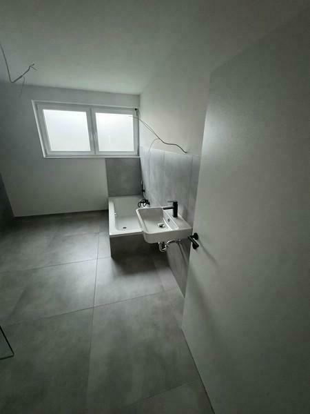 Beim Betreten der rollstuhlgerechten Wohnung gelangen Sie in einen zentralen Flur. Auf der rechten Seite befindet sich das Badezimmer mit Fenster, ausgestattet mit WC, Waschbecken, Badewanne, ebenerdiger Dusche und Waschmaschinenanschluss.