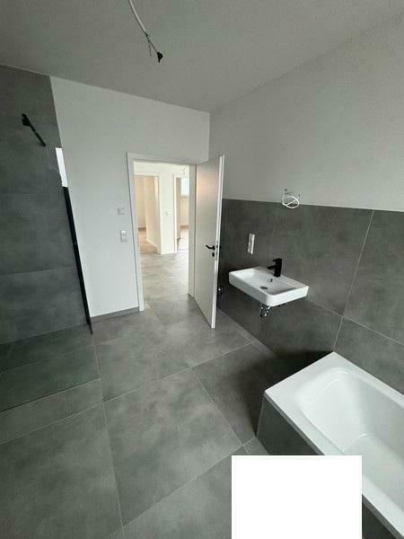 Beim Betreten der Wohnung gelangen Sie auf der linken Seite in das Badezimmer, das über ein Fenster, eine Dusche, eine Badewanne sowie einen Waschmaschinenanschluss verfügt.